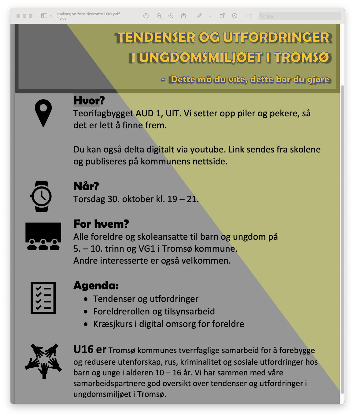 Invitasjon til møte med U16: Tendenser og utfordringer i ungdomsmiljøet i Tromsø U 16 inviterer foresatte til ungdom i alderen 10-16 år til informasjonsmøte torsdag 30.10 kl 1900 - 2100 på teorifagbygget AUD 1, UIT. Publisert 15.10.2025 15.35 Sist endret 15.10.2025 15.35